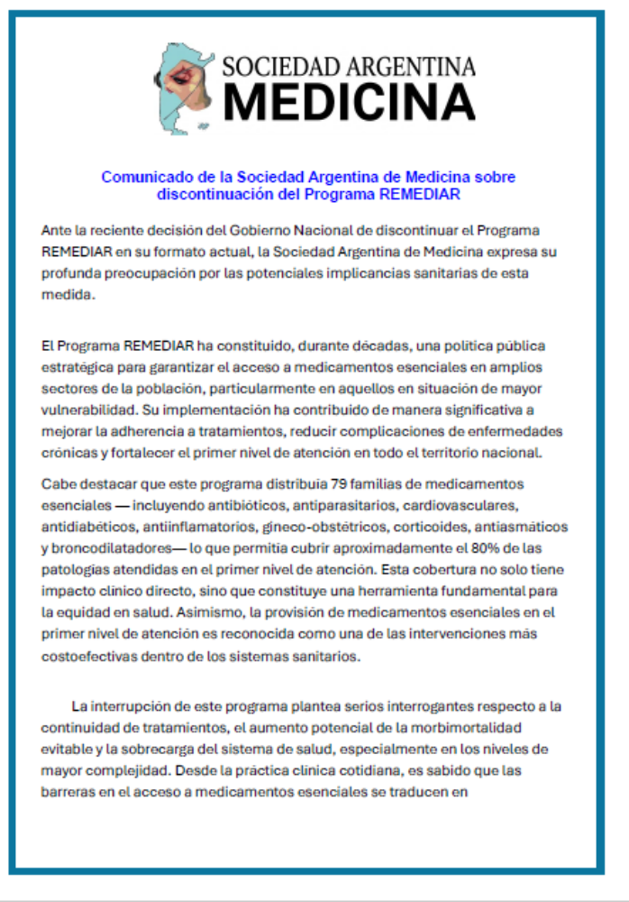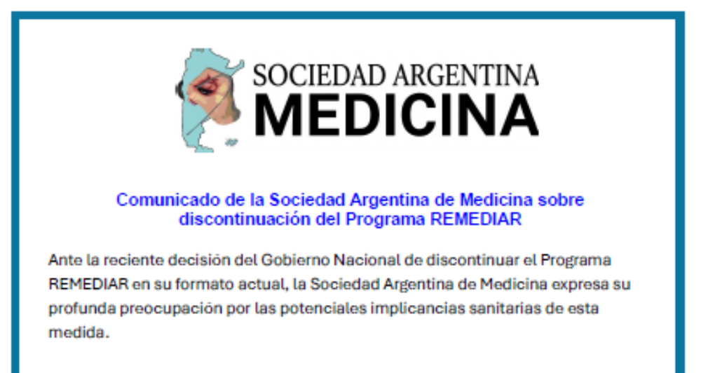 Comunicado de la Sociedad Argentina de Medicina sobre discontinuación del Programa REMEDIAR