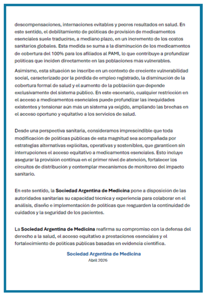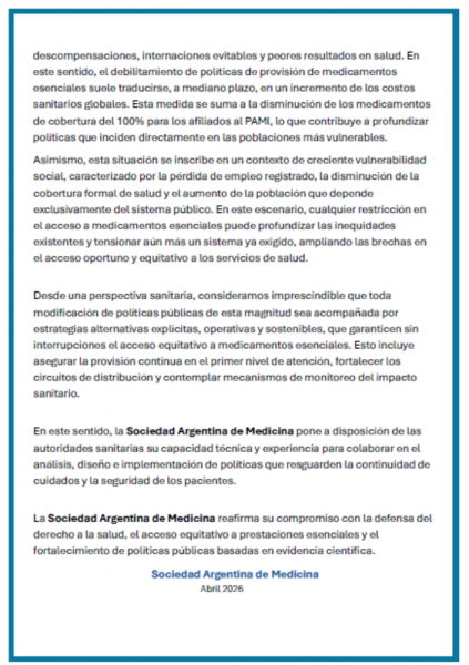 Comunicado de la Sociedad Argentina de Medicina sobre